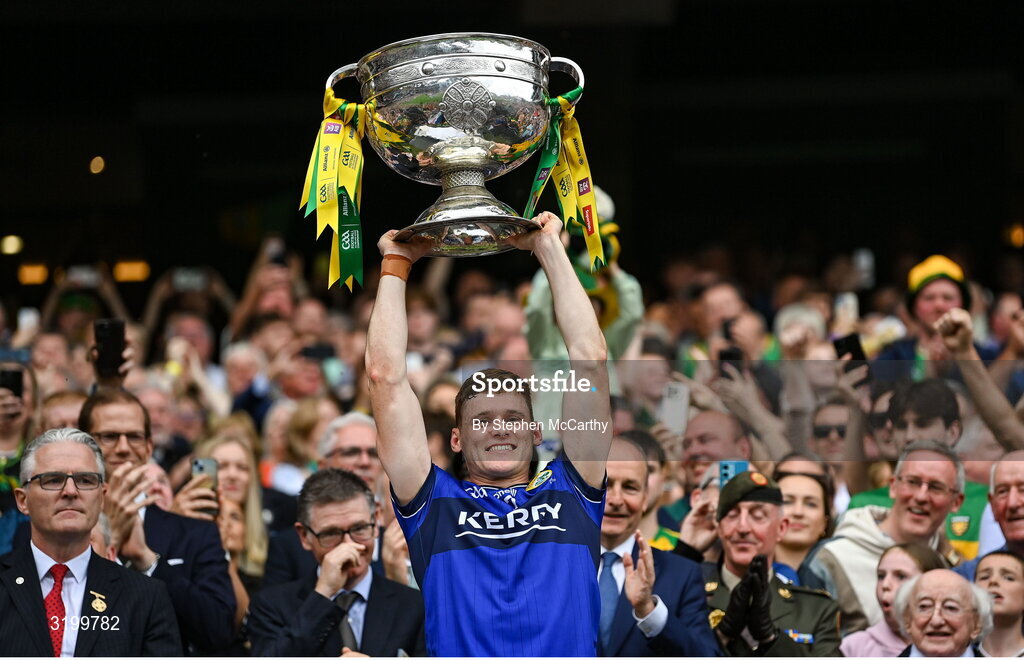 27 July 2025; Kerry captain Gavin White lifts the Sam Maguire cup after his side's victory in the GAA Football All-Ireland Senior Championship final match between Kerry and Donegal at Croke Park in Dublin. Photo by Stephen McCarthy/Sportsfile