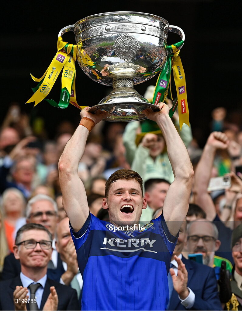 27 July 2025; Kerry captain Gavin White lifts the Sam Maguire cup after his side's victory in the GAA Football All-Ireland Senior Championship final match between Kerry and Donegal at Croke Park in Dublin. Photo by Stephen McCarthy/Sportsfile