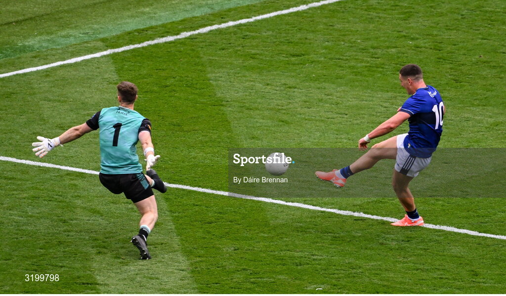 27 July 2025; Joe O'Connor of Kerry scores his side's first goal past Donegal goalkeeper Shaun Patton during the GAA Football All-Ireland Senior Championship final match between Kerry and Donegal at Croke Park in Dublin. Photo by Daire Brennan/Sportsfile