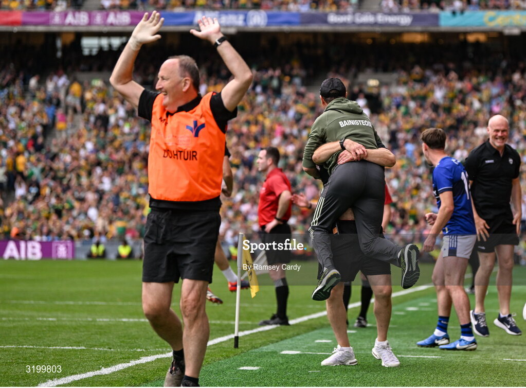 27 July 2025; Kerry manager Jack O'Connor, left, and coach Cian O'Neill celebrate their side's goal, scored by Joe O'Connor, not pictured, during the GAA Football All-Ireland Senior Championship final match between Kerry and Donegal at Croke Park in Dublin. Photo by Ramsey Cardy/Sportsfile