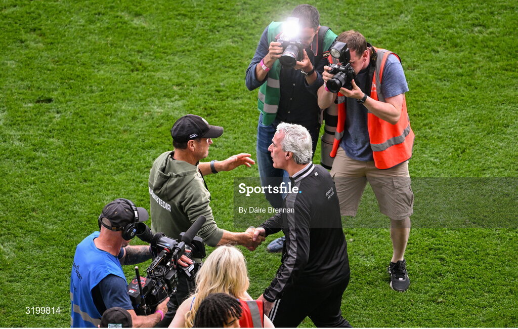 27 July 2025; Kerry manager Jack O'Connor, left, and Donegal manager Jim McGuinness shake hands after the GAA Football All-Ireland Senior Championship final match between Kerry and Donegal at Croke Park in Dublin. Photo by Daire Brennan/Sportsfile