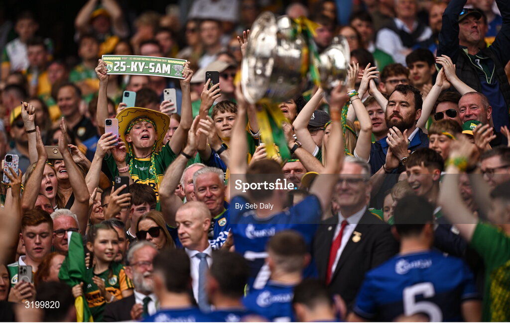 27 July 2025; Kerry supporters celebrate as Kerry captain Gavin White lifts the Sam Maguire cup after their side's victory in during the GAA Football All-Ireland Senior Championship final match between Kerry and Donegal at Croke Park in Dublin. Photo by Seb Daly/Sportsfile