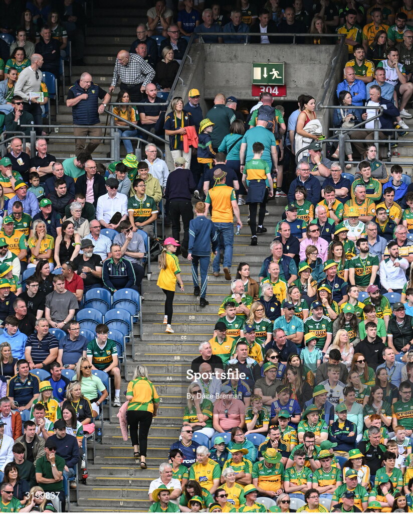 27 July 2025; Donegal supporters make their way toward the exit in the Cusack Stand near the end of the GAA Football All-Ireland Senior Championship final match between Kerry and Donegal at Croke Park in Dublin. Photo by Daire Brennan/Sportsfile