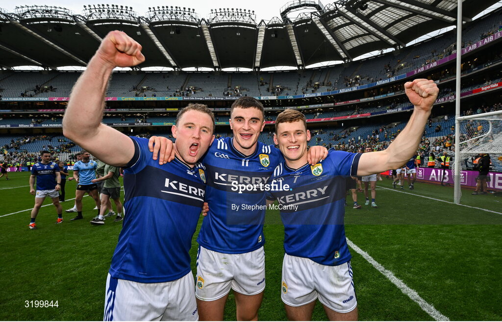 27 July 2025; Kerry players, from left, Tadhg Morley, Seán O'Shea and Gavin White celebrate after the GAA Football All-Ireland Senior Championship final match between Kerry and Donegal at Croke Park in Dublin. Photo by Stephen McCarthy/Sportsfile