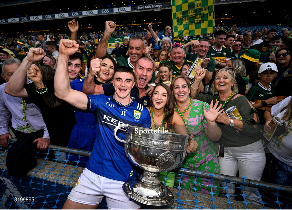 27 July 2025; Seán O'Shea of Kerry celebrates with his family and partner Molly O'Brien after the GAA Football All-Ireland Senior Championship final match between Kerry and Donegal at Croke Park in Dublin. Photo by David Fitzgerald/Sportsfile