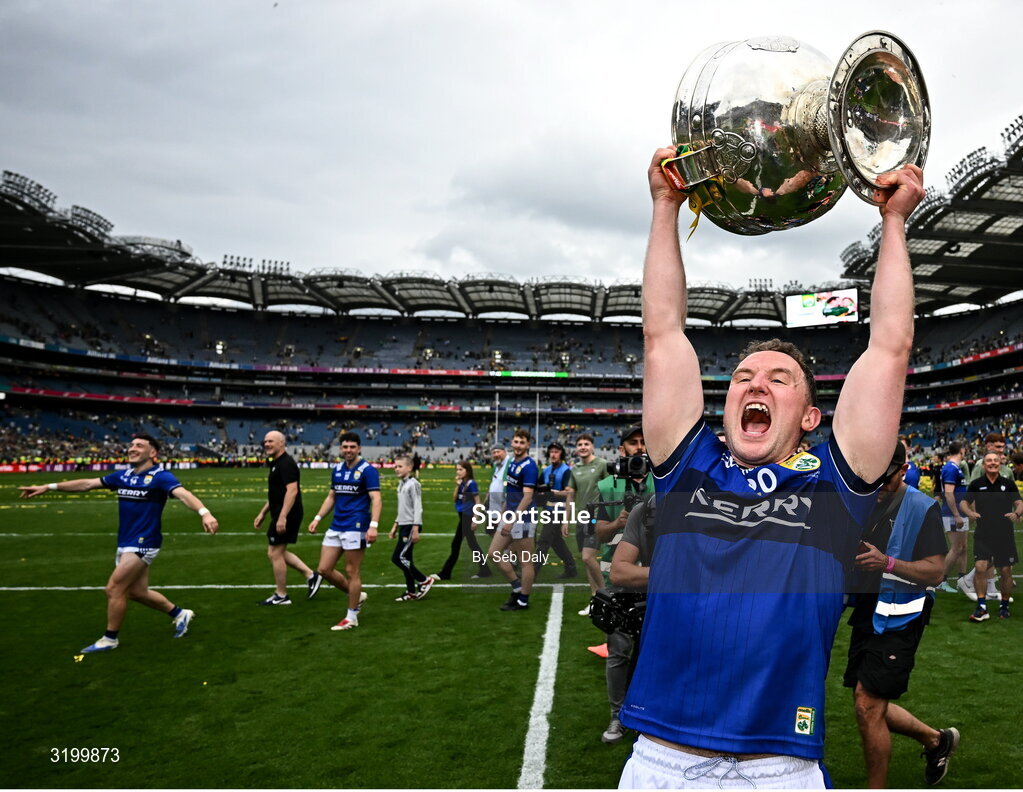 27 July 2025; Tadhg Morley of Kerry celebrates with the Sam Maguire cup after the GAA Football All-Ireland Senior Championship final match between Kerry and Donegal at Croke Park in Dublin. Photo by Seb Daly/Sportsfile