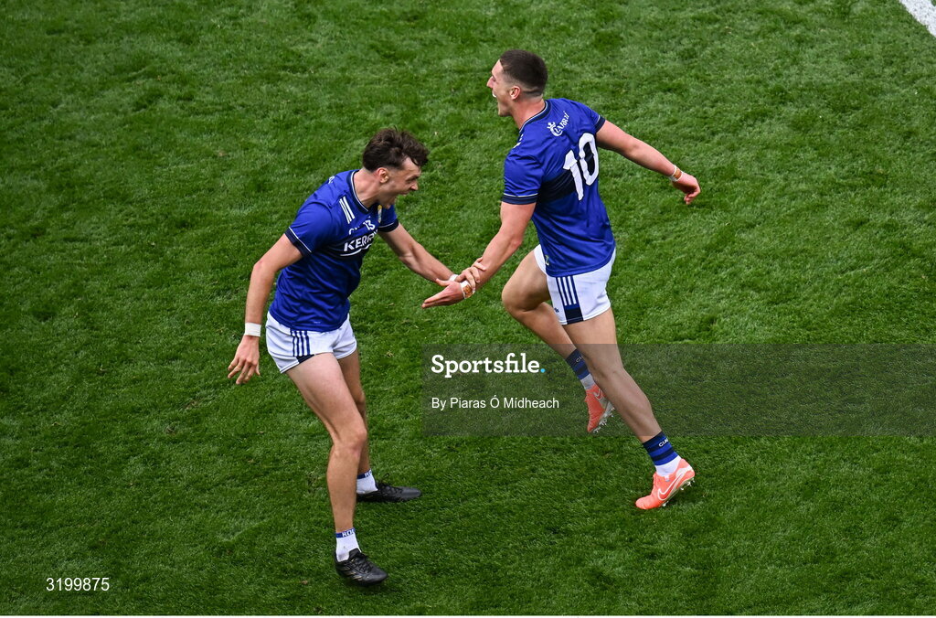 27 July 2025; Joe O'Connor of Kerry, right, celebrates with teammate David Clifford after scoring their goal during the GAA Football All-Ireland Senior Championship final match between Kerry and Donegal at Croke Park in Dublin. Photo by Piaras Ó Mídheach/Sportsfile