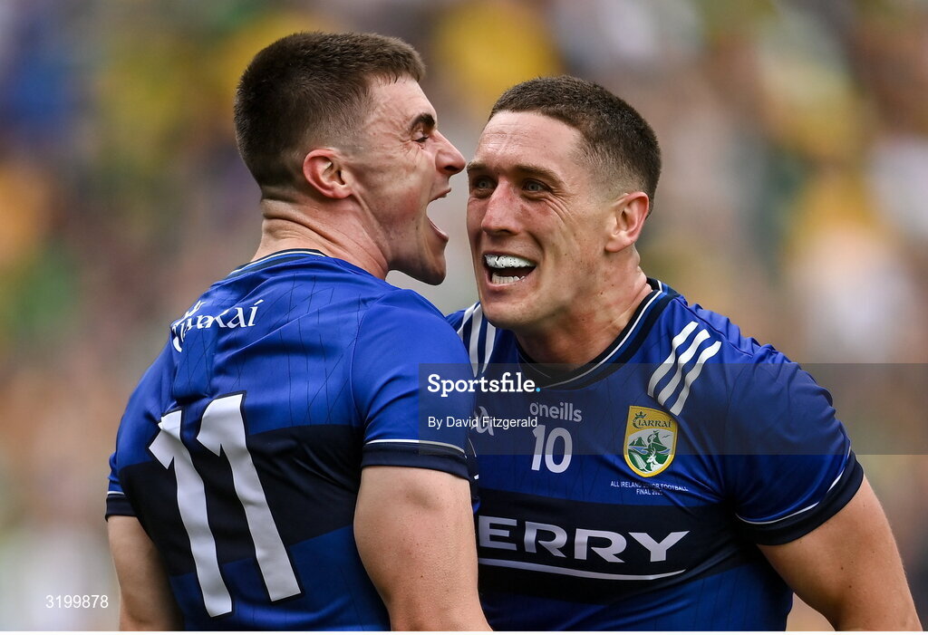 27 July 2025; Joe O'Connor, right, and Seán O'Shea of Kerry celebrate after the GAA Football All-Ireland Senior Championship final match between Kerry and Donegal at Croke Park in Dublin. Photo by David Fitzgerald/Sportsfile