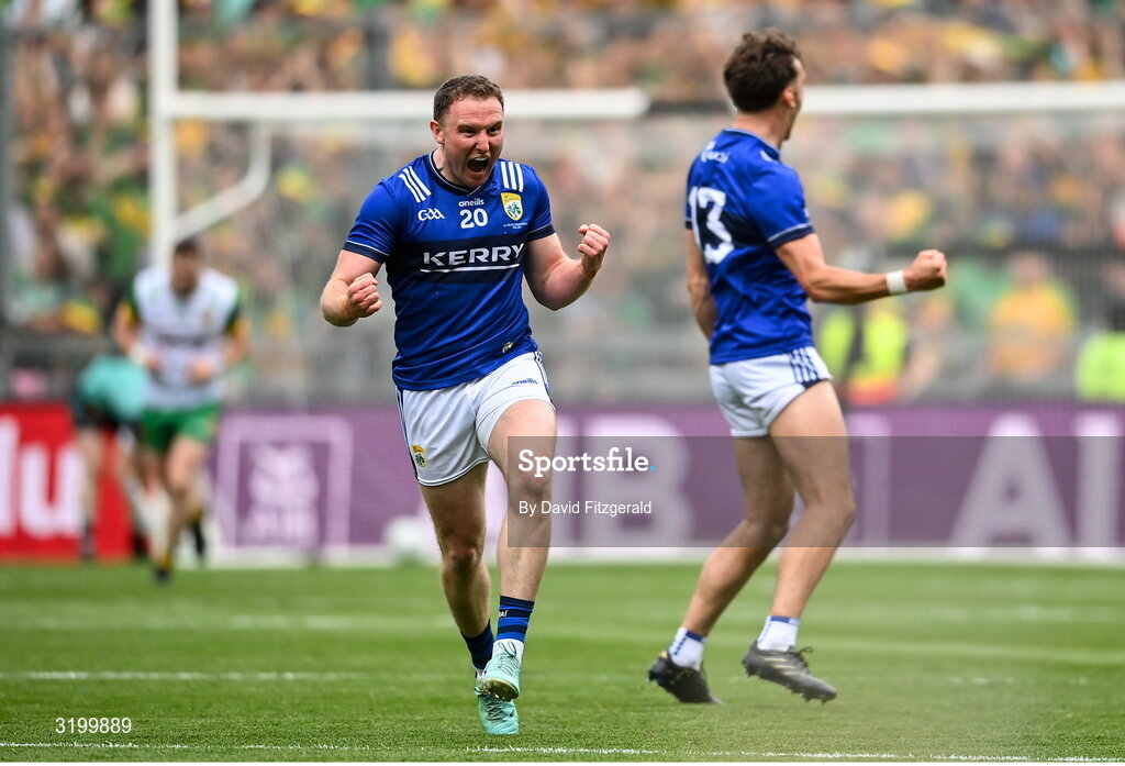 27 July 2025; Tadhg Morley, left, and David Clifford of Kerry celebrate their side's late goal during the GAA Football All-Ireland Senior Championship final match between Kerry and Donegal at Croke Park in Dublin. Photo by David Fitzgerald/Sportsfile