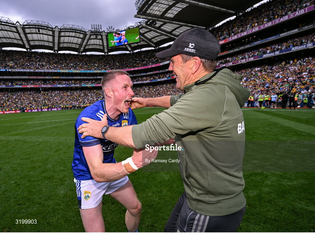 27 July 2025; Kerry manager Jack O'Connor celebrates with Jason Foley of Kerry after the GAA Football All-Ireland Senior Championship final match between Kerry and Donegal at Croke Park in Dublin. Photo by Ramsey Cardy/Sportsfile