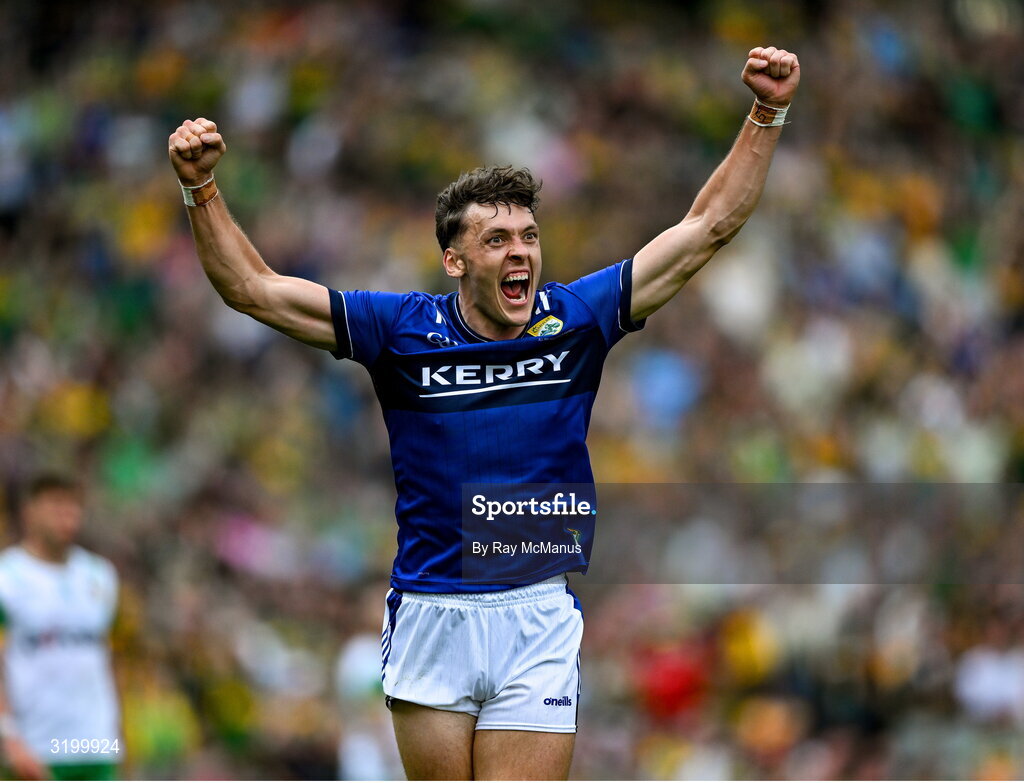 27 July 2025; David Clifford of Kerry celebrates a late goal, scored by his team mate Joe O'Connor, near the end of the GAA Football All-Ireland Senior Championship final match between Kerry and Donegal at Croke Park in Dublin. Photo by Ray McManus/Sportsfile