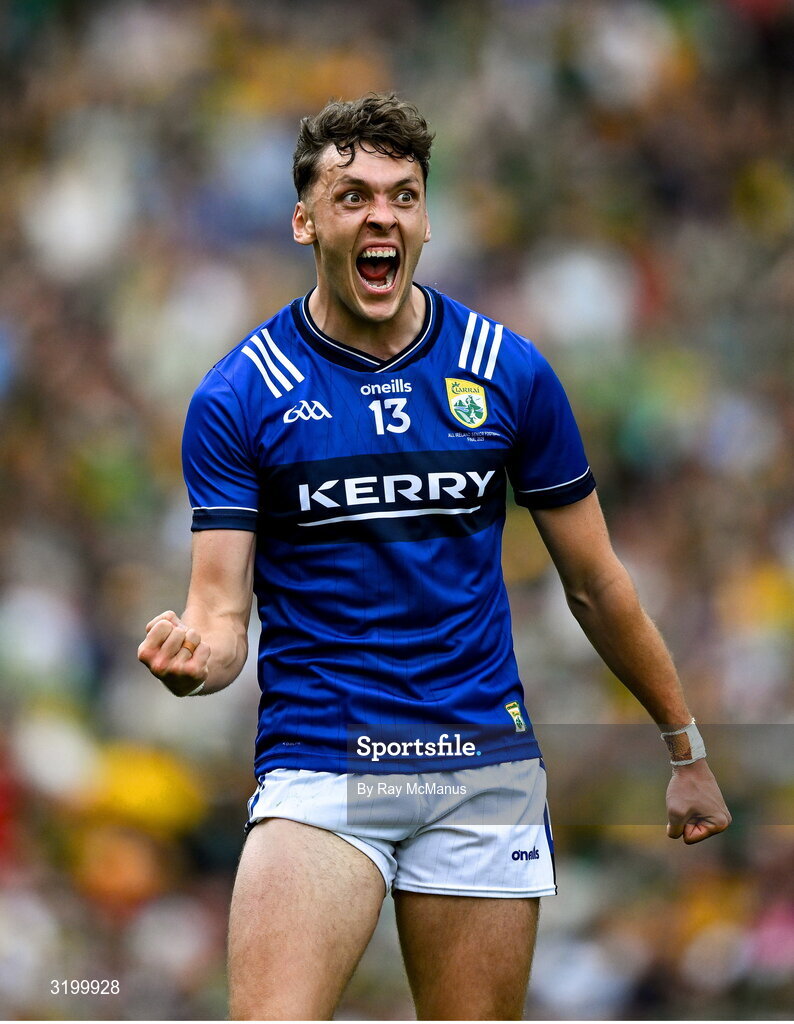 27 July 2025; David Clifford of Kerry celebrates a late goal, scored by his team mate Joe O'Connor, near the end of the GAA Football All-Ireland Senior Championship final match between Kerry and Donegal at Croke Park in Dublin. Photo by Ray McManus/Sportsfile