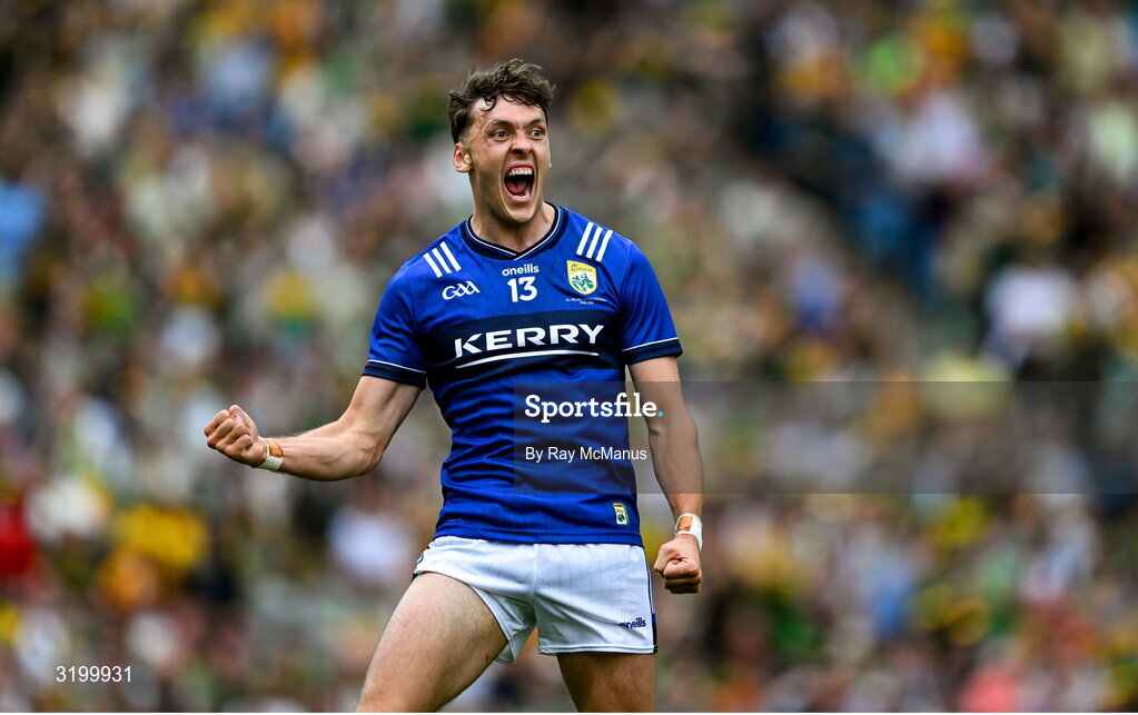 27 July 2025; David Clifford of Kerry celebrates a late goal, scored by his team mate Joe O'Connor, near the end of the GAA Football All-Ireland Senior Championship final match between Kerry and Donegal at Croke Park in Dublin. Photo by Ray McManus/Sportsfile