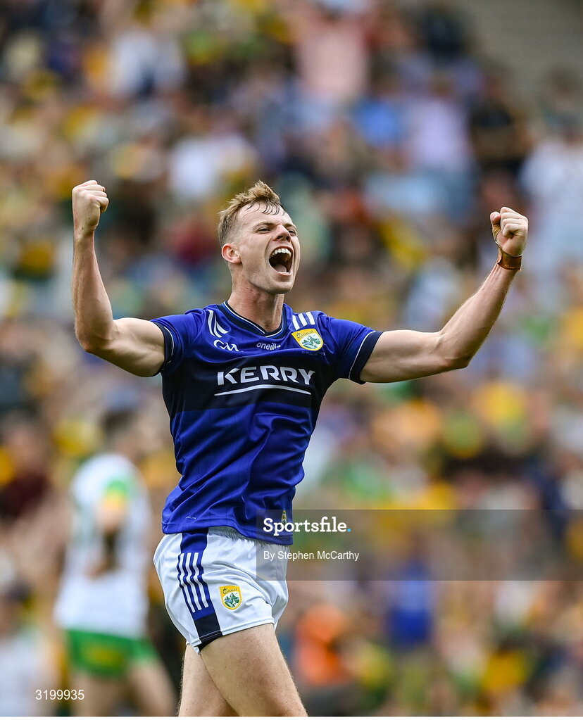 27 July 2025; Mark O'Shea of Kerry celebrates his side's goal, scored by Joe O'Connor, not pictured, during the GAA Football All-Ireland Senior Championship final match between Kerry and Donegal at Croke Park in Dublin. Photo by Stephen McCarthy/Sportsfile