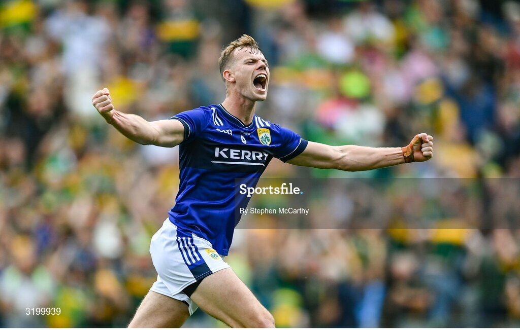 27 July 2025; Mark O'Shea of Kerry celebrates his side's goal, scored by Joe O'Connor, not pictured, during the GAA Football All-Ireland Senior Championship final match between Kerry and Donegal at Croke Park in Dublin. Photo by Stephen McCarthy/Sportsfile