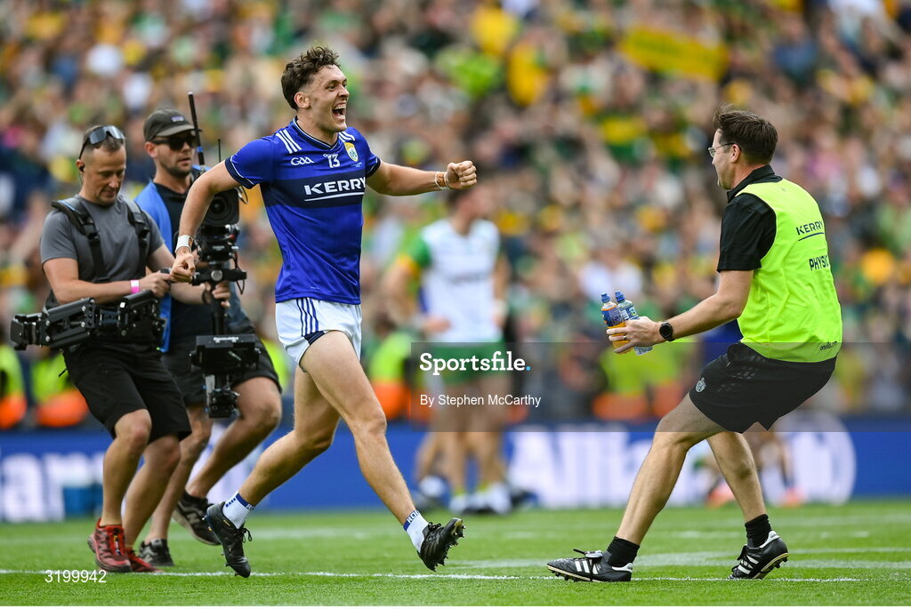 27 July 2025; David Clifford of Kerry celebrates with team chartered physiotherapist Paudie McQuinn after the GAA Football All-Ireland Senior Championship final match between Kerry and Donegal at Croke Park in Dublin. Photo by Stephen McCarthy/Sportsfile
