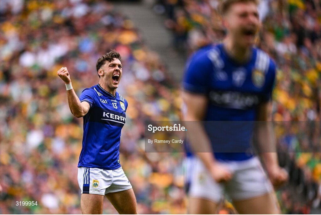 27 July 2025; David Clifford of Kerry celebrates a late point during the GAA Football All-Ireland Senior Championship final match between Kerry and Donegal at Croke Park in Dublin. Photo by Ramsey Cardy/Sportsfile