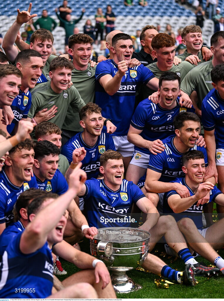 27 July 2025; The Kerry team celebrate with Sam Maguire cup after the GAA Football All-Ireland Senior Championship final match between Kerry and Donegal at Croke Park in Dublin. Photo by Ramsey Cardy/Sportsfile