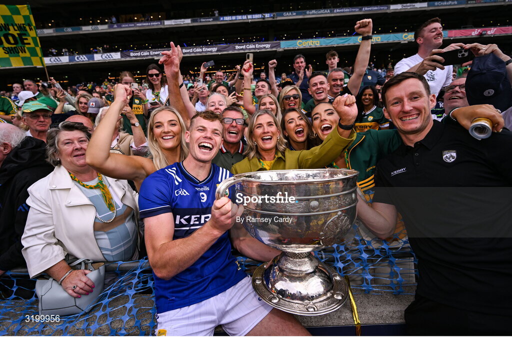 27 July 2025; Mark O'Shea of Kerry celebrates with the Sam Maguire cup after the GAA Football All-Ireland Senior Championship final match between Kerry and Donegal at Croke Park in Dublin. Photo by Ramsey Cardy/Sportsfile