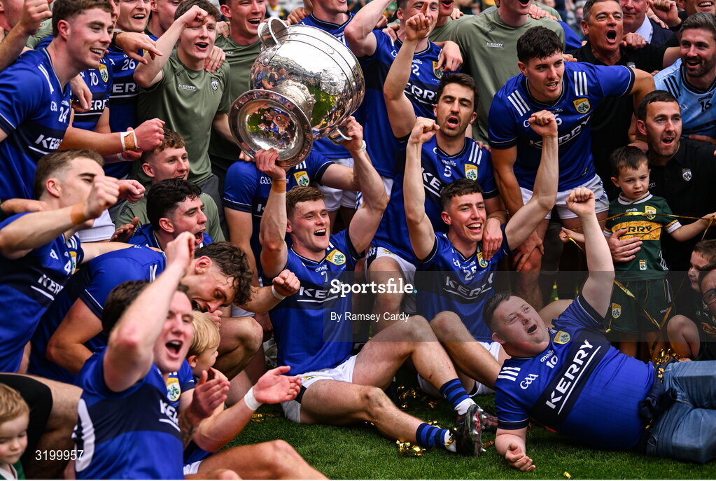 27 July 2025; The Kerry team celebrate with Sam Maguire cup after the GAA Football All-Ireland Senior Championship final match between Kerry and Donegal at Croke Park in Dublin. Photo by Ramsey Cardy/Sportsfile