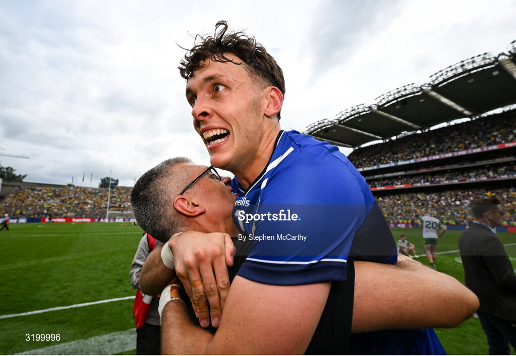 27 July 2025; David Clifford of Kerry celebrates with selector Aodán Mac Gearailt after the GAA Football All-Ireland Senior Championship final match between Kerry and Donegal at Croke Park in Dublin. Photo by Stephen McCarthy/Sportsfile