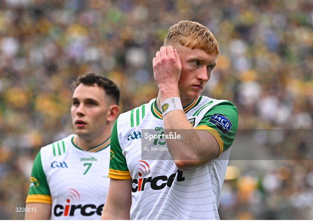27 July 2025; Donegal players Oisin Gallen, front, and Caolan McColgan after their side's defeat in the GAA Football All-Ireland Senior Championship final match between Kerry and Donegal at Croke Park in Dublin. Photo by Seb Daly/Sportsfile