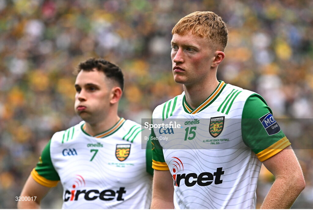 27 July 2025; Donegal players Oisin Gallen, front, and Caolan McColgan after their side's defeat in the GAA Football All-Ireland Senior Championship final match between Kerry and Donegal at Croke Park in Dublin. Photo by Seb Daly/Sportsfile