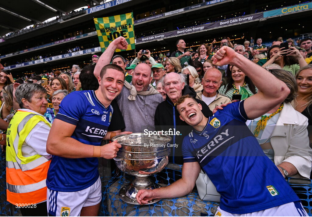 27 July 2025; Evan Looney, left, and Mark O'Shea of Kerry with the Sam Maguire cup after the GAA Football All-Ireland Senior Championship final match between Kerry and Donegal at Croke Park in Dublin. Photo by Ramsey Cardy/Sportsfile