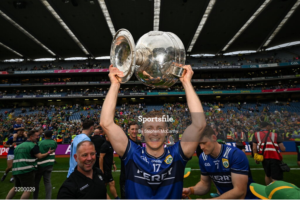 27 July 2025; Killian Spillane of Kerry celebrates with the Sam Maguire cup after their side's victory in the GAA Football All-Ireland Senior Championship final match between Kerry and Donegal at Croke Park in Dublin. Photo by Stephen McCarthy/Sportsfile
