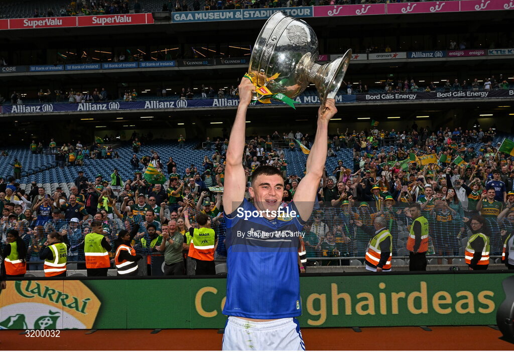 27 July 2025; Seán O'Shea of Kerry celebrates with the Sam Maguire cup after their side's victory in the GAA Football All-Ireland Senior Championship final match between Kerry and Donegal at Croke Park in Dublin. Photo by Stephen McCarthy/Sportsfile