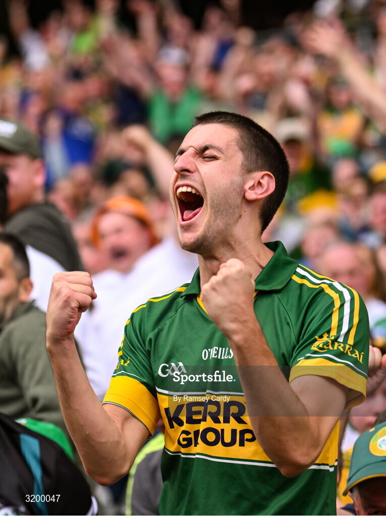 27 July 2025; Kerry supporters celebrate their side's first goal, scored by Joe O'Connor, during the GAA Football All-Ireland Senior Championship final match between Kerry and Donegal at Croke Park in Dublin. Photo by Ramsey Cardy/Sportsfile