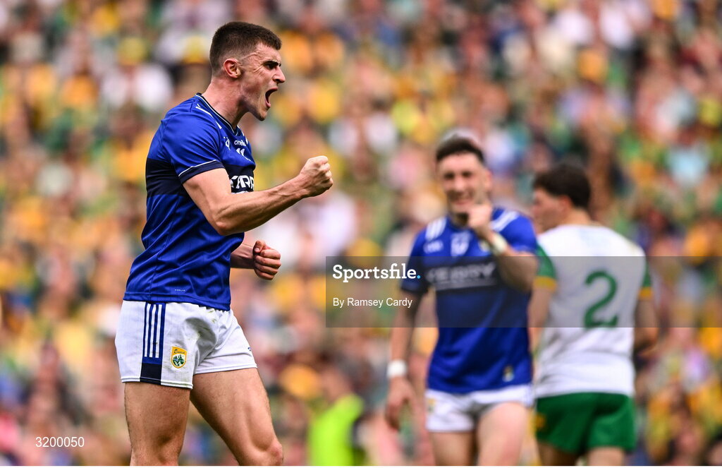 27 July 2025; Seán O'Shea of Kerry celebrates a point during the GAA Football All-Ireland Senior Championship final match between Kerry and Donegal at Croke Park in Dublin. Photo by Ramsey Cardy/Sportsfile
