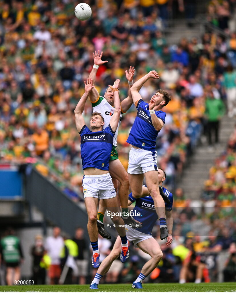 27 July 2025; Mark O'Shea, left, and Seán O'Brien of Kerry compete for a high ball against Michael Murphy of Donegal during the GAA Football All-Ireland Senior Championship final match between Kerry and Donegal at Croke Park in Dublin. Photo by Ramsey Cardy/Sportsfile