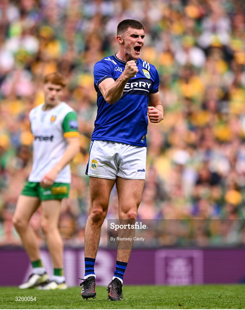 27 July 2025; Seán O'Shea of Kerry celebrates a point during the GAA Football All-Ireland Senior Championship final match between Kerry and Donegal at Croke Park in Dublin. Photo by Ramsey Cardy/Sportsfile