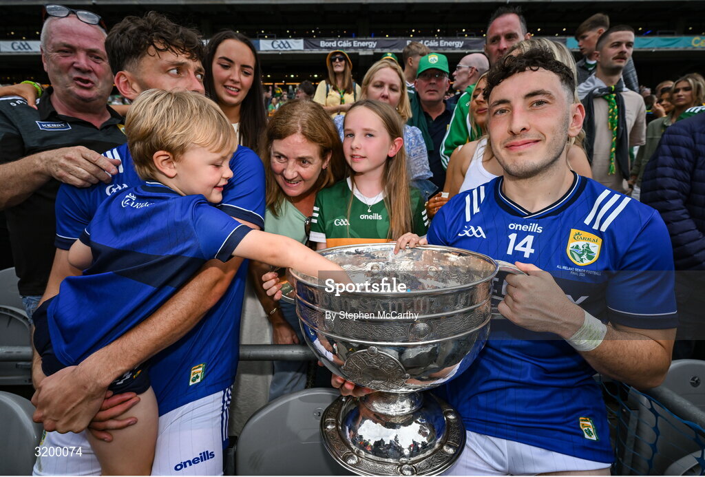 27 July 2025; Kerry's David Clifford and his son Ogie, left, and brother Paudie Clifford, right, celebrate with family after the GAA Football All-Ireland Senior Championship final match between Kerry and Donegal at Croke Park in Dublin. Photo by Stephen McCarthy/Sportsfile