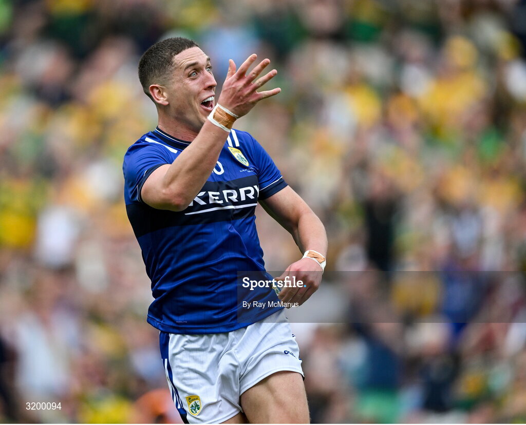 27 July 2025; Joe O'Connor of Kerry celebrates a late goal during the GAA Football All-Ireland Senior Championship final match between Kerry and Donegal at Croke Park in Dublin. Photo by Ray McManus/Sportsfile
