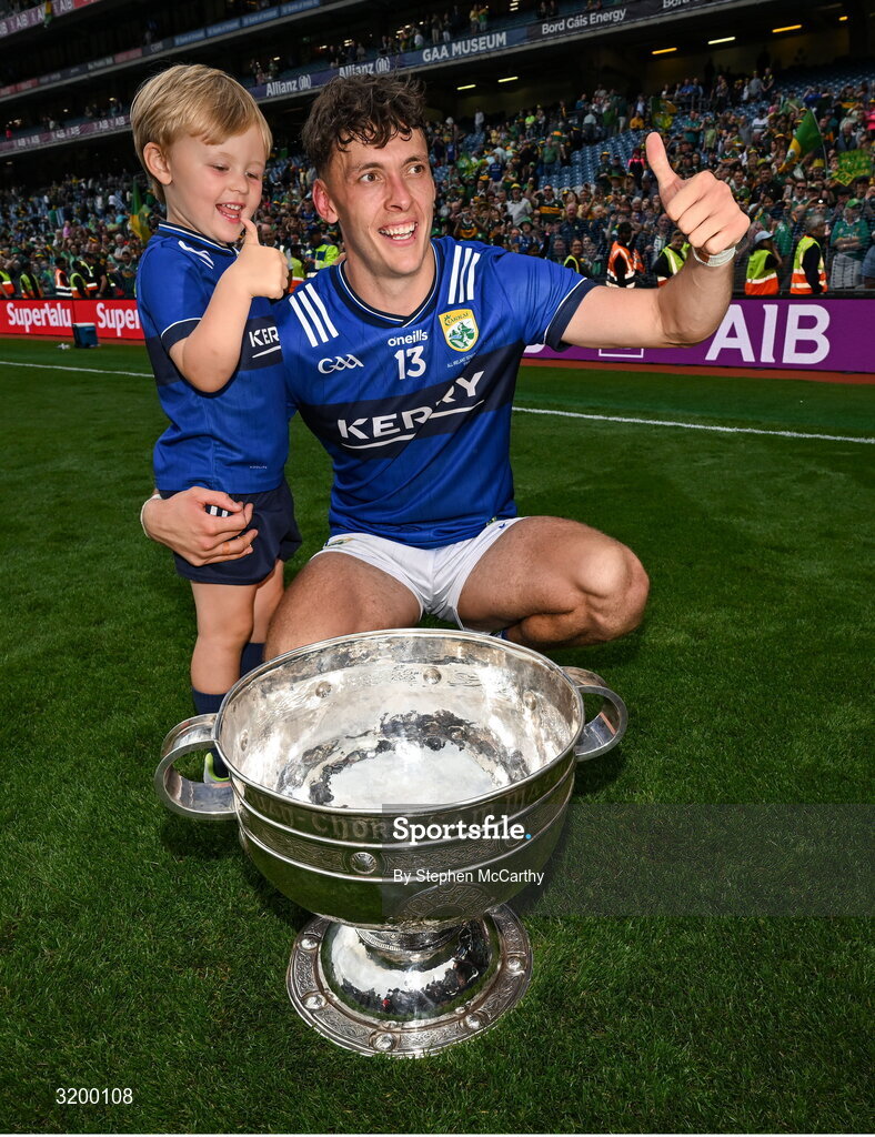 27 July 2025; Kerry's David Clifford and his son Ogie celebrate with the Sam Maguire cup after their side's victory in the GAA Football All-Ireland Senior Championship final match between Kerry and Donegal at Croke Park in Dublin. Photo by Stephen McCarthy/Sportsfile