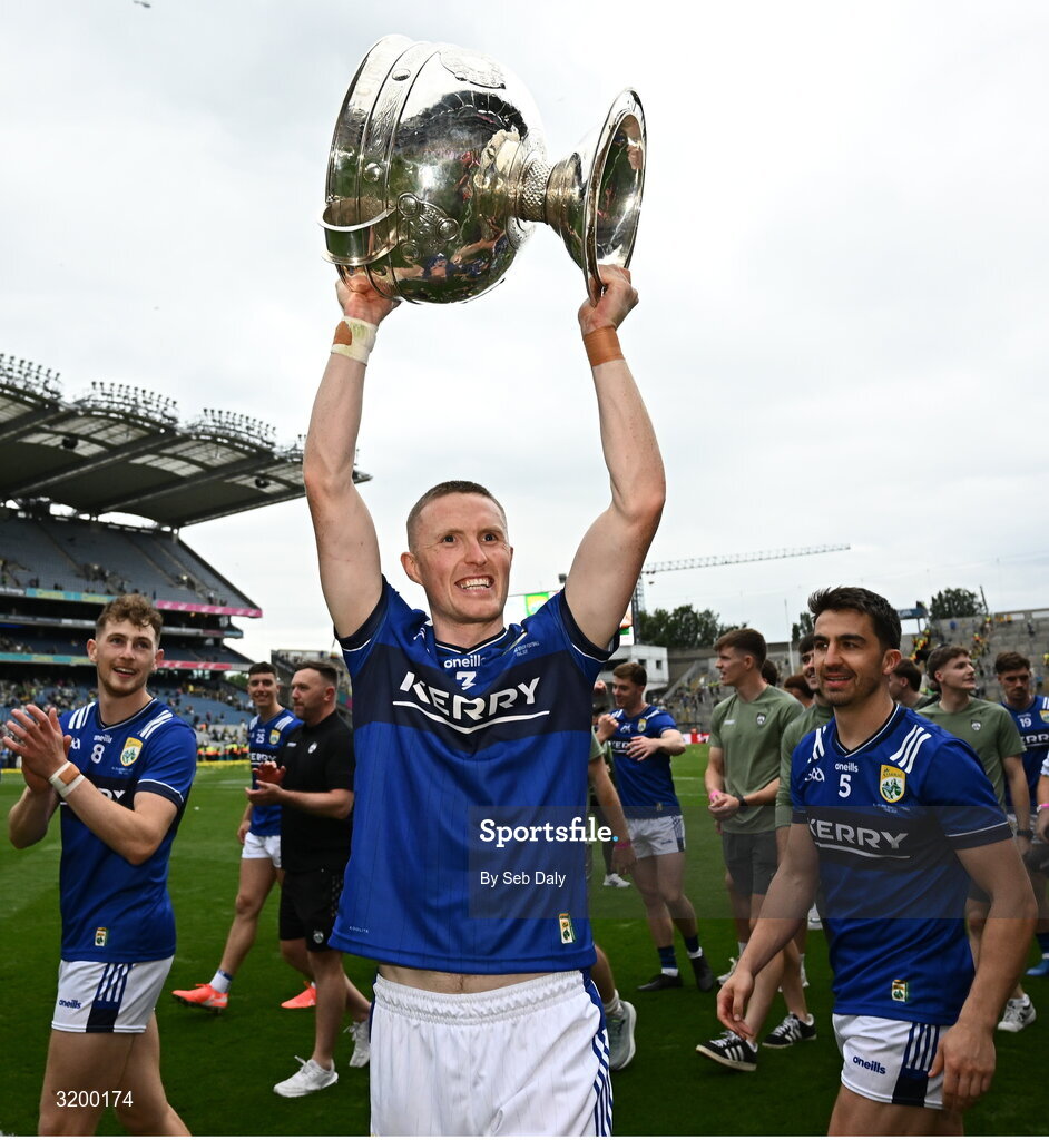 27 July 2025; Jason Foley of Kerry celebrates with the Sam Maguire cup after his side's victory in the GAA Football All-Ireland Senior Championship final match between Kerry and Donegal at Croke Park in Dublin. Photo by Seb Daly/Sportsfile
