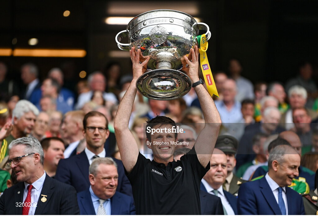 27 July 2025; Kerry backroom team member Cian O'Connor lifts the Sam Maguire cup after the GAA Football All-Ireland Senior Championship final match between Kerry and Donegal at Croke Park in Dublin. Photo by Stephen McCarthy/Sportsfile