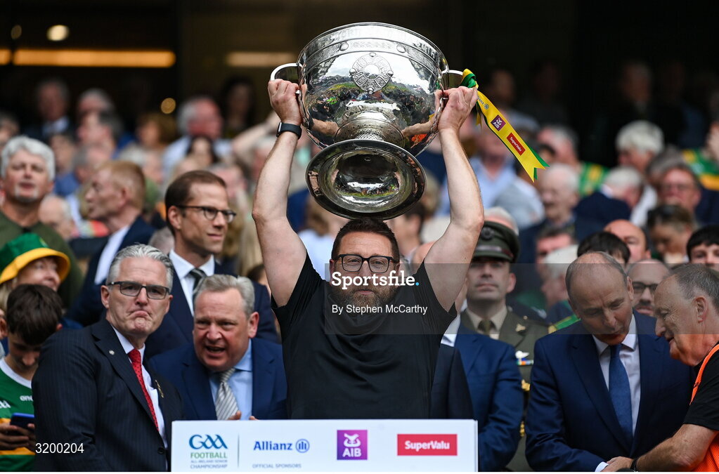 27 July 2025; Kerry head coach Cian O'Neill lifts the Sam Maguire cup after the GAA Football All-Ireland Senior Championship final match between Kerry and Donegal at Croke Park in Dublin. Photo by Stephen McCarthy/Sportsfile