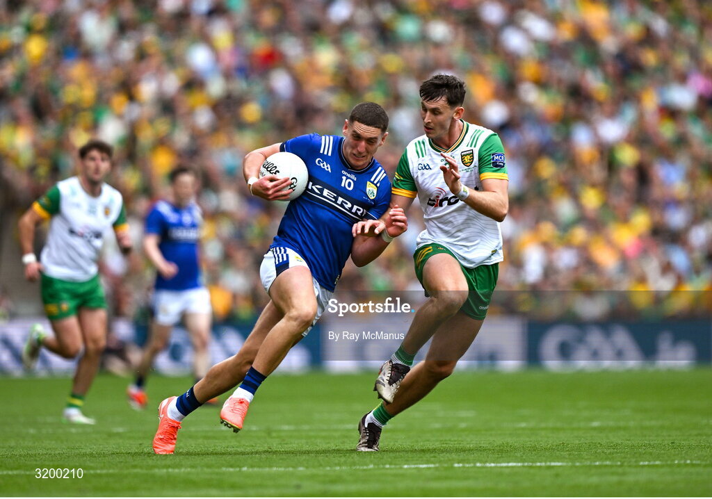 27 July 2025; Joe O'Connor of Kerry in action against Michael Langan of Donegal during the GAA Football All-Ireland Senior Championship final match between Kerry and Donegal at Croke Park in Dublin. Photo by Ray McManus/Sportsfile