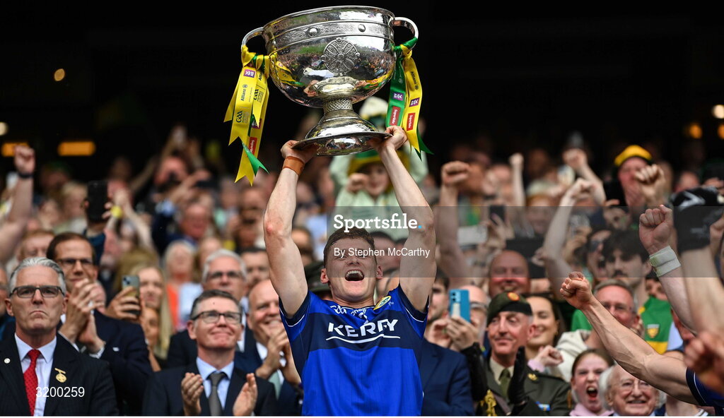 27 July 2025; Kerry captain Gavin White lift the Sam Maguire cup after the GAA Football All-Ireland Senior Championship final match between Kerry and Donegal at Croke Park in Dublin. Photo by Stephen McCarthy/Sportsfile
