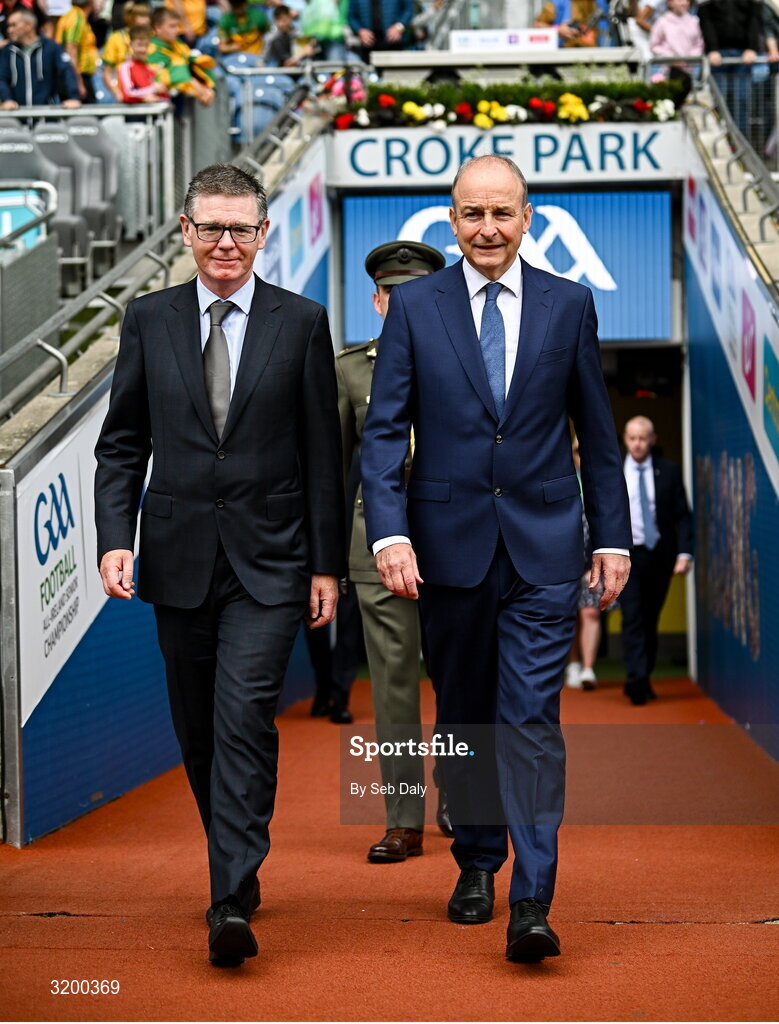 27 July 2025; An Taoiseach Micheál Martin TD, right, and Ard Stiúrthóir of the GAA Tom Ryan before the GAA Football All-Ireland Senior Championship final match between Kerry and Donegal at Croke Park in Dublin. Photo by Seb Daly/Sportsfile