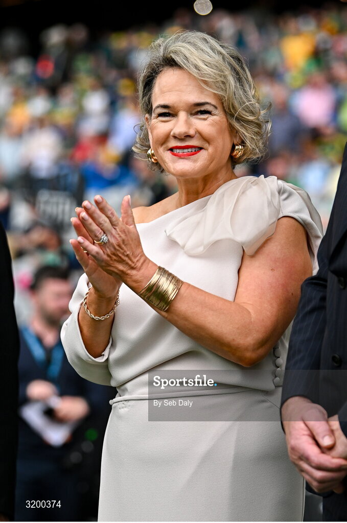 27 July 2025; Suzanne Burns, wife of Uachtarán Chumann Lúthchleas Gael Jarlath Burns, before the GAA Football All-Ireland Senior Championship final match between Kerry and Donegal at Croke Park in Dublin. Photo by Seb Daly/Sportsfile