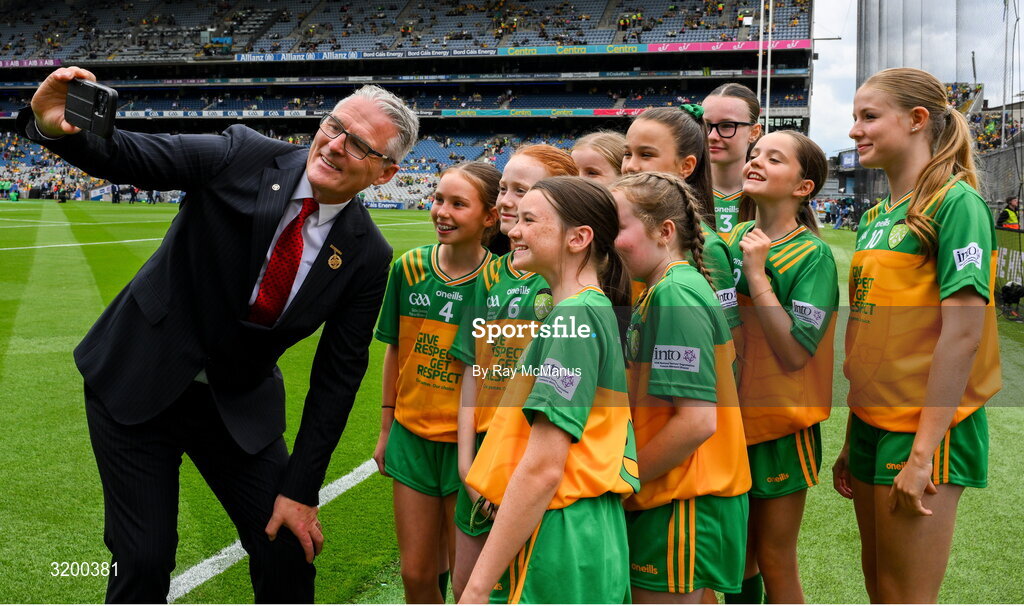 27 July 2025; Uachtarán Chumann Lúthchleas Gael Jarlath Burns poses for a 'selfie' with members of the Donegal team whe competed in GAA INTO Cumann na mBunscol Respect Exhibition Go Games at the GAA Football All-Ireland Senior Championship final match between Kerry and Donegal at Croke Park in Dublin. Photo by Ray McManus/Sportsfile