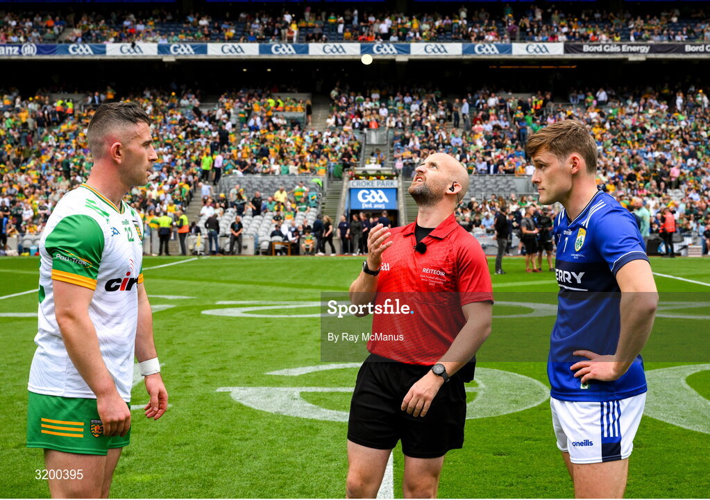27 July 2025; The two captains, Patrick McBrearty of Donegal and Gavin White of Kerry, watch as referee Brendan Cawley tosses a coin before the GAA Football All-Ireland Senior Championship final match between Kerry and Donegal at Croke Park in Dublin. Photo by Ray McManus/Sportsfile