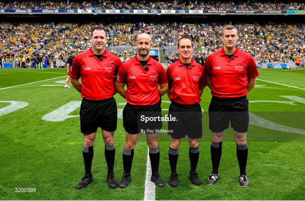 27 July 2025; Match referee Brendan Cawley, second from left, with his line umpires Martin McNally and David Coldrick, and sideline official Thomas Murphy before the GAA Football All-Ireland Senior Championship final match between Kerry and Donegal at Croke Park in Dublin. Photo by Ray McManus/Sportsfile