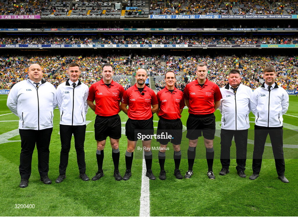 27 July 2025; Referee Brendan Cawley with with his line umpires Martin McNaly, David Coldrick, sideline official, Thomas Murphy and score umpires David Coady, Lee Moore, Eoghan Fitzpatrick and Johnny Farrell before the GAA Football All-Ireland Senior Championship final match between Kerry and Donegal at Croke Park in Dublin. Photo by Ray McManus/Sportsfile