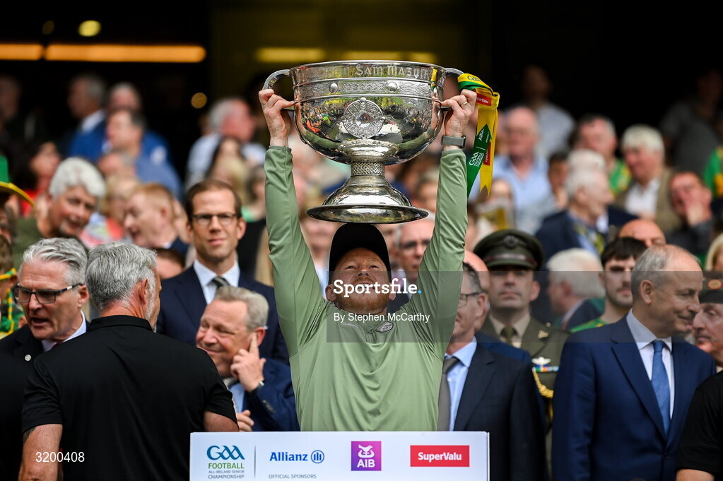 27 July 2025; Kerry sport psychologist Cathal Sheridan lifts the Sam Maguire cup after the GAA Football All-Ireland Senior Championship final match between Kerry and Donegal at Croke Park in Dublin. Photo by Stephen McCarthy/Sportsfile