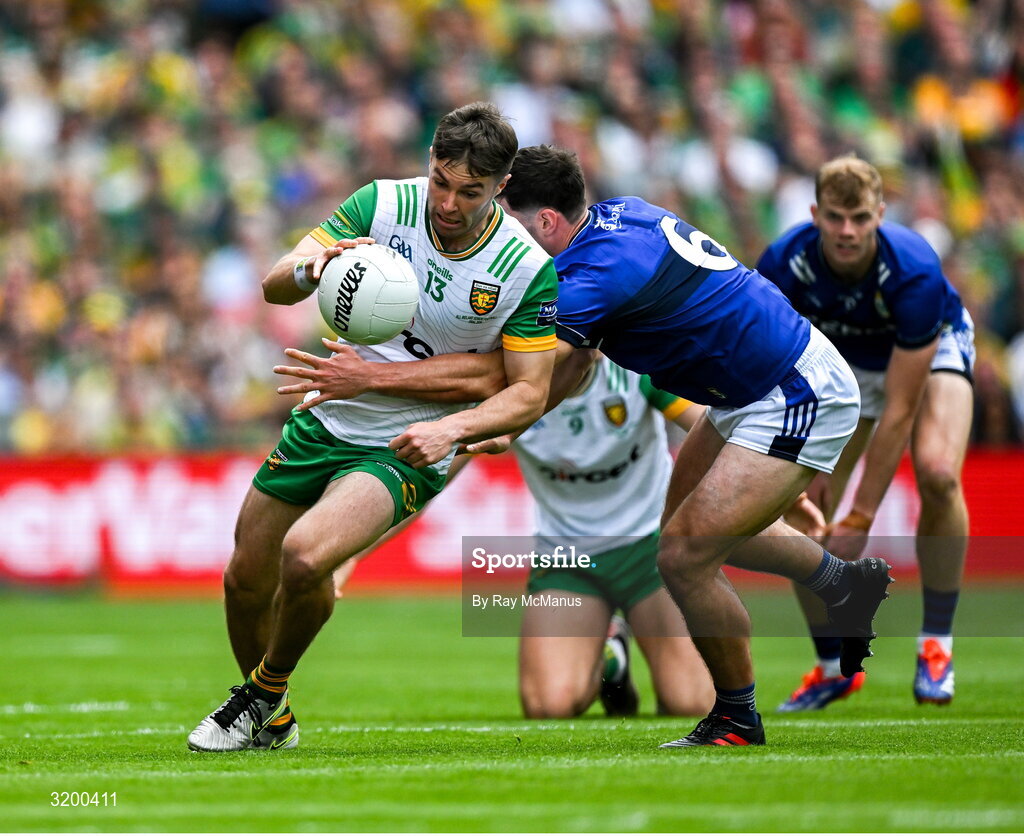 27 July 2025; Conor O'Donnell of Donegal is tackled by Mike Breen of Kerry during the GAA Football All-Ireland Senior Championship final match between Kerry and Donegal at Croke Park in Dublin. Photo by Ray McManus/Sportsfile